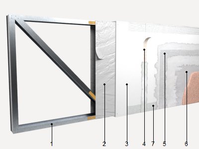 Mise en place et fixation provisoire de l'imperméabilisation. Mise en place et vissage des plaques à la structure. Traitement des joints. Mise en place du profilé d'arrêt en angle. Extension de la couche de mortier base et mise en place de la maille. Application de la couche d'apprêt. Application de la couche de finition.