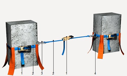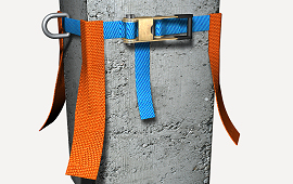 Dispositif d'ancrage capable de supporter une charge de 25 kN, constitué de sangle en polyester de 35 mm de largeur, tendeur avec mécanisme à blocage anti-retour et anneau, amortissable en 3 utilisations, pour la fixation au support en béton ou métallique de 0,8 à 3,6 m de périmètre.