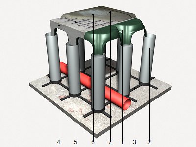 Coffrage perdu avec pièces en polypropylène recyclé, de 58x58x15 cm, à disposer sur des tubes en PVC, sur une matrice de base, pour planchers surélévés grande hauteur sur vide sanitaire.