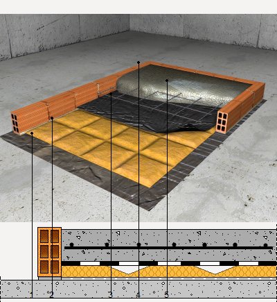 Implantation et tracé du socle. Mise en place du film en polyéthylène. Mise en place et fixation du coffrage périmétrique. Mise en place du panneau antivibratoire. Mise en place de l'isolant acoustique. Mise en place des armatures avec des séparateurs homologués. Préparation du béton. Coulage et compactage du béton. Réglage et nivellement de la dalle de compression. Séchage du béton.