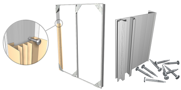 Précadre d'aluminium, de 36x19x1,5 mm, assemblé à l'aide d'équerres et avec des vis pour la fixation au parement et pour la fixation de la menuiserie.